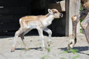„In den ersten sechs Monaten trägt das Jungtier sein helles Jugendkleid – wodurch die dunkle Schnauze umso mehr auffällt – und hebt sich dadurch deutlich von den anderen Tieren ab. Karibu-Kälber erkennen ihre Mütter übrigens an der Stimme. Wenn ein Karibu-Weibchen das Rufen eines Kalbes hört, antwortet es mit einem gedämpften Ruf. Diesen Ruf erwidert nur das eigene Kalb, indem es auf seine Mutter zuläuft. Einfach mal hinhören!“ – Erlebnis-Zoo Hannover