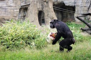 Tortendiebstahl – Schimpansin Victoria macht sich mit der Torte davon | Foto Erlebnis-Zoo Hannover