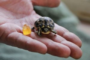Angeblich sollen diese Schildkröten bis zu 70 Jahre alt werden können. Die kleine Schildkröte in Hannover hat also einiges an Zeit, sich an der Erhaltung ihrer Art aktiv zu beteiligen. Insgesamt sind drei Unterarten (P. a. oblonga, P. a. arachnoides und P. a. brygooi) bekannt. Die Nominatform ist die Unterart, die noch am meisten verbreitet ist, aber wirklich viele gibt es von allen drei Unterarten nicht mehr. Daher zählt jedes neugeschenkte Leben. Welches Geschlecht die kleine Schildkröte hat, erklärt der Erlebnis-Zoo Hannover, „lässt sich erst nach ungefähr fünf Jahren bestimmen: Bei männlichen Tieren bildet sich an der Panzerunterseite eine Mulde und der Schwanz ist deutlich länger als bei den Weibchen.“ Bei der Geburt war die Schildkröte so groß wie das Gummibärchen, das nun dem Größenvergleich dient, neben ihr.