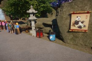 Fünf Gehege und viele Besucher kann man auf dem Screenshot, der, wie alle anderen auch, im Rahmen des Zitatrechts zum Zwecke der journalistischen Berichterstattung hier gezeigt wird, erahnen. Ebenso entdeckt man auch Gebäude für Tiere und Mitarbeiter. Das zeigt eine wesentliche Stärke des Spiels auf: man kann überhaupt mal Themenwelten schaffen. Das funktioniert auch von großen Gebäuden bis hin zu kleinen Details wie man es auf dem Screenshots rechts gut sehen kann. Im Artikel Immersion im Zoo wurde ja dargelegt wie wichtig Details bei der Gestaltung von Themenwelten sind. Wer also Landschaften gestaltet und gerne dekoriert, kommt voll auf seine Kosten. Es könnten zwar noch etwas mehr Elemente sein, aber auch schon jetzt kommt man gut mit Laternen, Karren, Schildern und mehr aus.